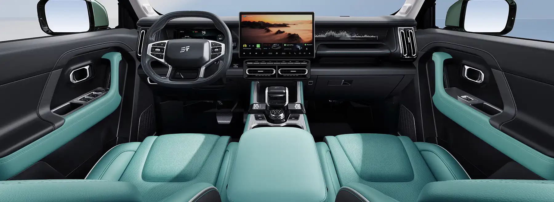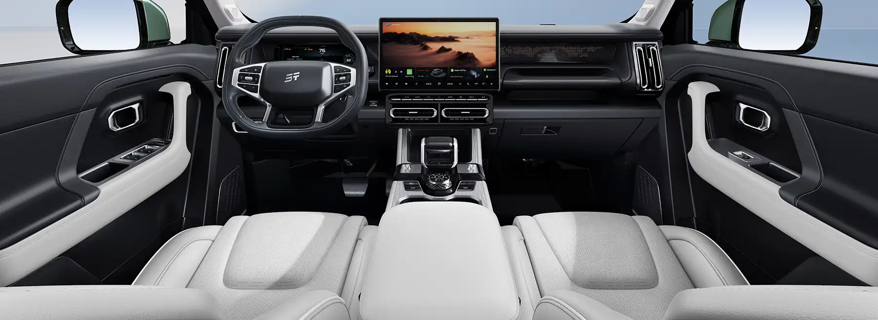Двухзонный климат-контроль оснащен эффективным фильтром стандарта CN95, который гарантирует чистый воздух. Физические кнопки для управления климат-контролем расположены под центральным экраном.